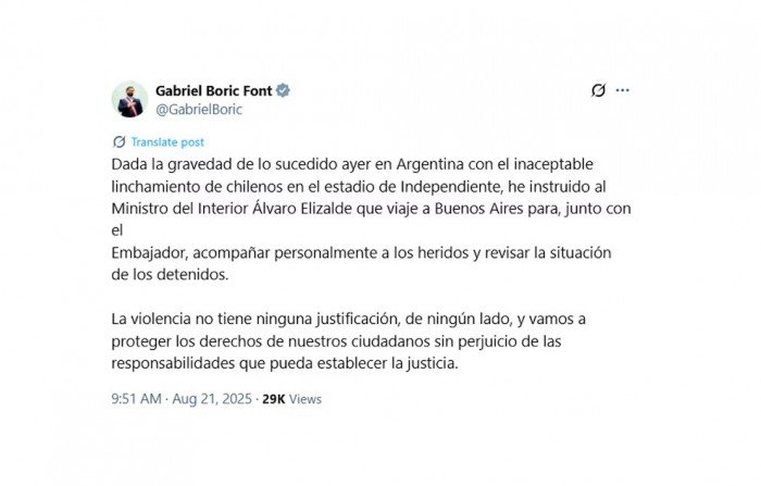 “Dada la gravedad de lo sucedido ayer en Argentina con el inaceptable linchamiento de chilenos en el estadio de Independiente, he instruido al Ministro del Interior que viaje a Buenos Aires para acompañar personalmente a los heridos y revisar la situación de los detenidos”, escribió Boric en su cuenta de X.
