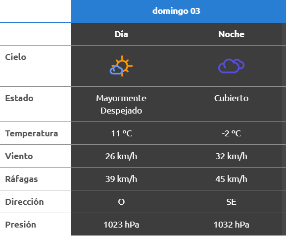 El parte del servicio meteorológico prevé que para después del mediodía el cielo estará algo nublado y los vientos del sector sudoeste tendrán velocidades estimadas de entre 7 y 12 km/h. La temperatura pronosticada sería de 8 grados.