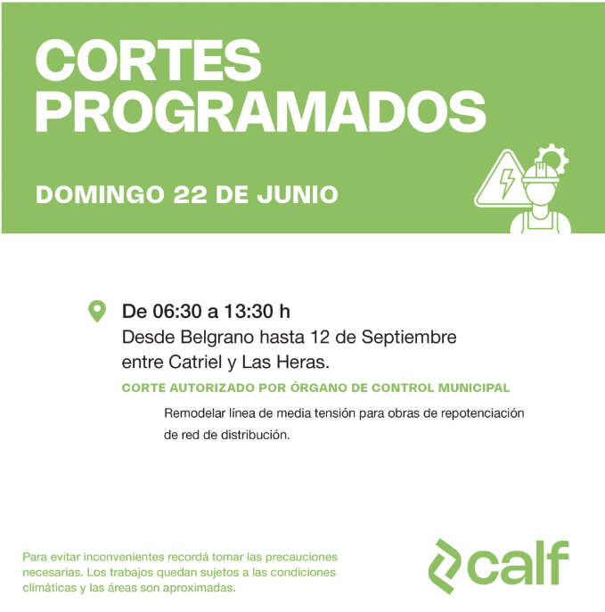La Cooperativa CALF informó que este domingo 23 de junio habrá un corte de energía programado de 6:30 a 13:30, autorizado por el órgano de control municipal. Afectará el cuadrante comprendido entre las calles Belgrano y 12 de Septiembre, entre Catriel y Las Heras.