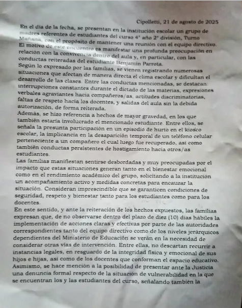 Las familias remarcaron que su intención no es que el estudiante abandone la escuela, pero exigen que se tomen medidas para garantizar la seguridad de la comunidad educativa.
