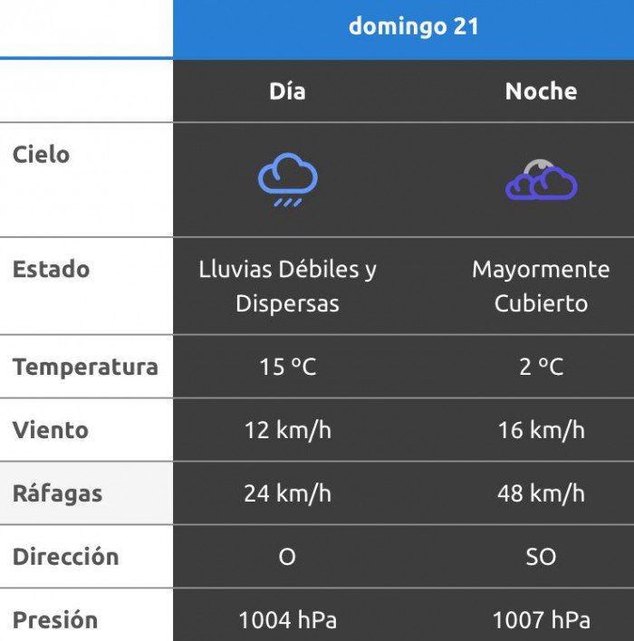 Después del mediodía el cielo estará parcialmente nublado y los vientos del sector sudoeste tendrán velocidades estimadas entre 32 y 41 km/h. La temperatura pronosticada sería de 16 grados. A la noche, el clima rondará los 9 grados, mientras que los vientos serán del sudoeste y soplarán a una velocidad de 32 y 41 kilómetros por hora. La probabilidad de lluvia estaría en el orden del por ciento para esta franja del día.