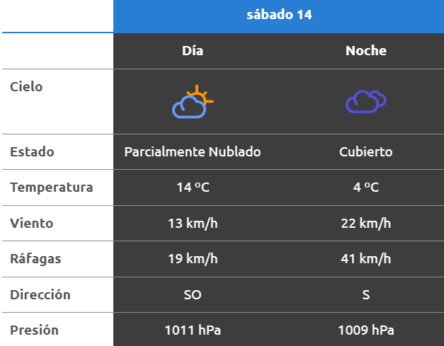 Para después del mediodía el cielo estará mayormente nublado y los vientos del sector sudoeste tendrán velocidades estimadas entre 32 y 41 km/h. La temperatura pronosticada sería de 17 grados.