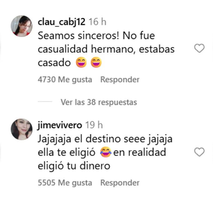 Entre los comentarios más destacados: “Jajajaja el destino seee jajaja ella te eligió en realidad eligió tu dinero”, “Seamos sinceros! No fue casualidad hermano, estabas casado” y “Mira si el destino va a estar ocupado en ustedes”. Otro usuario fue más directo: “No, no fue casualidad… Fue infidelidad”.