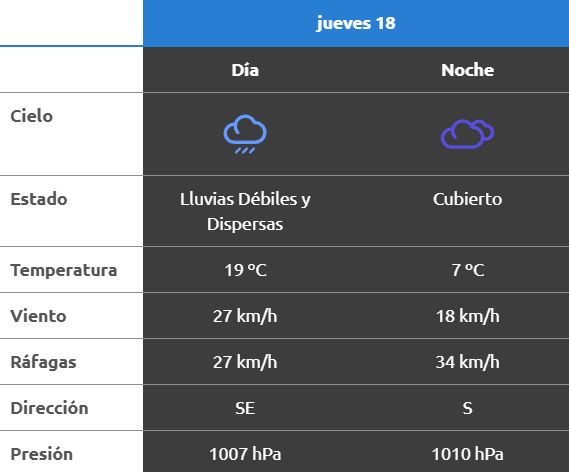 El parte del servicio meteorológico prevé que para después del mediodía el cielo estará nublado y los vientos del sector noroeste tendrán velocidades estimadas de entre 13 y 22 km/h. La temperatura pronosticada sería de 13 grados.