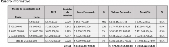 Solo en el primer trimestre de este año, con la aplicación de la actual escala, el costo empresario ascendió a $ 14,8 millones de pesos, y hubiera bajado a 2,8 millones, si se aplicara el arancel del 0,5% que entrará en vigencia a partir de la nueva disposición, indicaron fuentes oficiales.