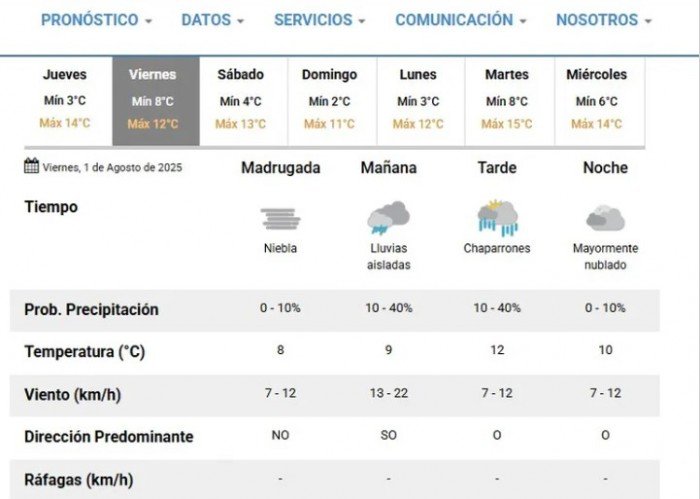 En la capital provincial, el SMN pronostica una jornada con lluvias y chaparrones, aunque con una probabilidad menor al 40%. También se podría registrar niebla en la madrugada. Se espera una temperatura mínima de 8°C y una máxima de 12°C, con muy poco viento durante el día.
