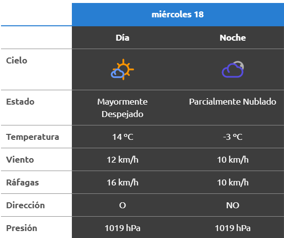 El parte del servicio meteorológico prevé que para después del mediodía el cielo estará algo nublado y los vientos del sector oeste tendrán velocidades estimadas de entre 7 y 12 km/h. La temperatura pronosticada sería de 14 grados.