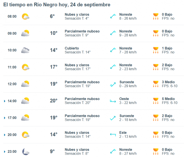 De acuerdo al parte del Servicio Meteorológico Nacional, el clima en esta ciudad de Río Negro se presentaría sin lluvias, y los vientos del norte correrán a una velocidad de entre 32 y 41 kilómetros por hora. La humedad sería del 92 por ciento, y la visibilidad sería buena.