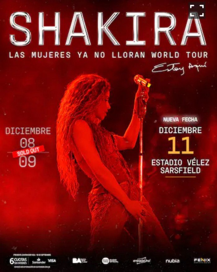 La cantante colombiana Shakira agregó una tercera fecha en Argentina en el marco de su gira Las Mujeres Ya No Lloran World Tour. El nuevo concierto se realizará el jueves 11 de diciembre en el Estadio Vélez, con producción de Fénix Entertainment.