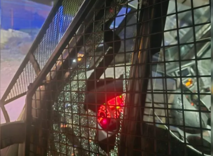 Una de las piedras arrojadas rompió la ventana del patrullero.